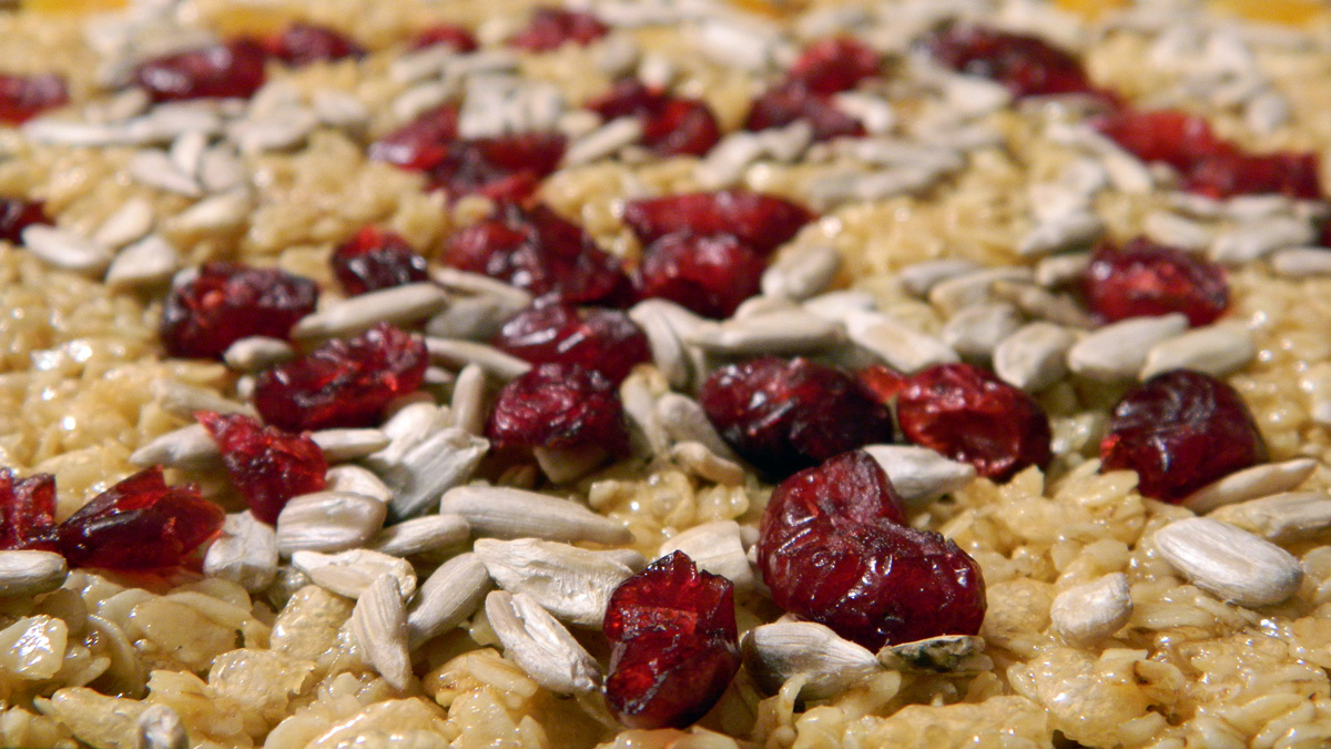 - Pack the mixture down to form a large thin square of granola bar, let this cool two hours before cutting. We use a rolling pin to form an even block of granola and allow the pin to ride on the sides on the cooking pan.
